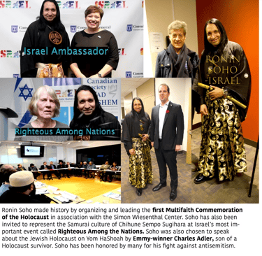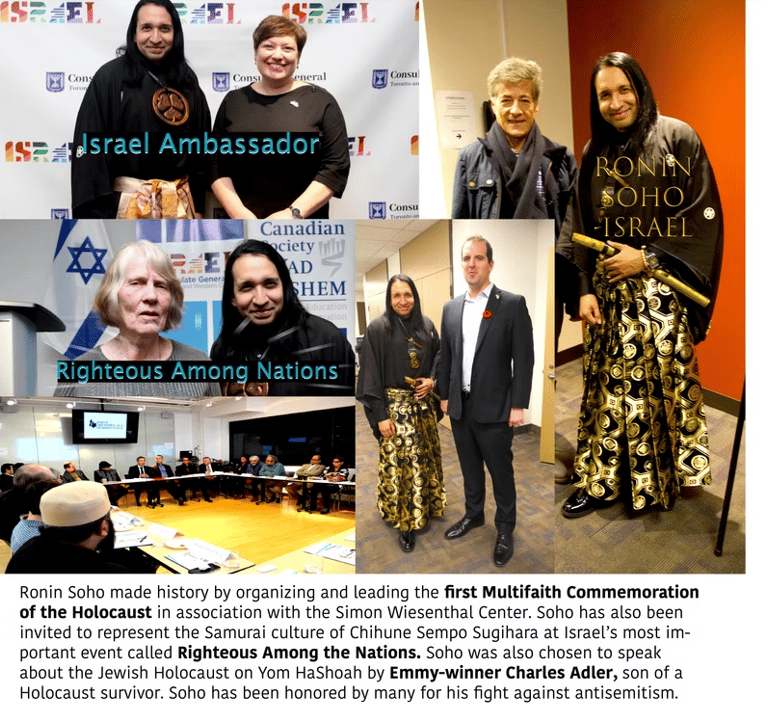 Ronin Soho was given the high honor of being invited to the Righteous Among the Nations event by Govt of Israel and Yad Vashem for his role in combating antisemitism in association with the Simon Wiesenthal Center. Soho has also been praised by CJN for his efforts at reaching out to the Jewish community to combat Jew Hatred. Soho's work is apolitical and strictly in line with humanitarian ideals to promote peace and compassion among all communities.