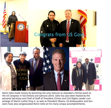 Soho is the only person ever to attend the US Congress in Samurai attire and he has also been praised by various high-level leaders -- from US Ambassadors and Senators to Chiefs of Staff for President Bill Clinton, Secy of State Hillary Clinton and the Spiritual advisor to President Obama. Soho has also lectured alongside the Civil Rights icon and protege of MLK Jr to much acclaim.